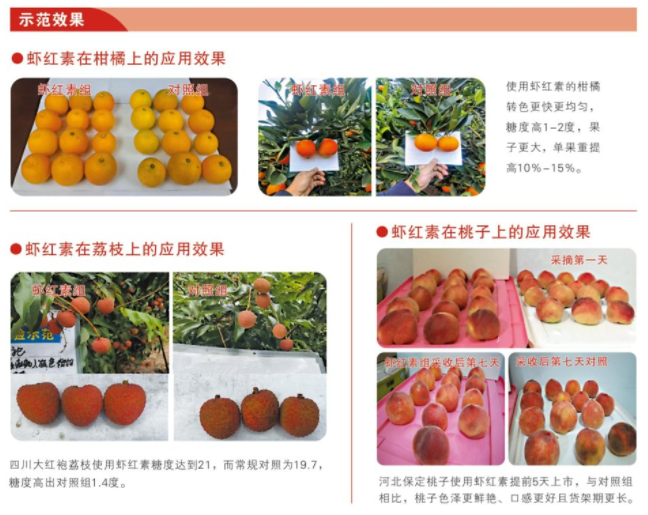 蝦紅素是采用先進(jìn)的萃取工藝,從海洋蝦蟹中提取出苯丙氨酸、天冬氨酸等氨基酸,和蝦青素、甲殼寡聚糖等多種生物活性物質(zhì),與銅、鐵、錳、鋅、硼等微量元素配制而成的新型生物刺激劑,不含激素,可促進(jìn)轉(zhuǎn)色、提高果實(shí)品質(zhì)。