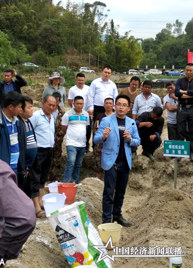 博泰公司詹少波在2018年永德縣移栽培訓(xùn)會(huì)現(xiàn)場(chǎng)為大家講解蝦肽肥的使用方法(詹少波供圖)