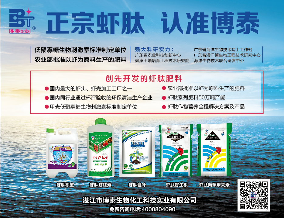 據(jù)了解,湛江市博泰生物化工科技實業(yè)有限公司專注于海洋生物資源的綜合利用開發(fā)產(chǎn)業(yè)20年,公司通過多項集成技術(shù)將從蝦頭、蝦殼、海螺等海洋生物中提取的多種活性氨基酸、甲殼素、殼聚糖、甲殼低聚寡糖、蝦腦磷脂、蝦紅素、活性鈣等功能活性成分,以及有益菌群等研制成新型功能性生物有機(jī)肥、土壤調(diào)理劑等系列海洋生物肥料,多種復(fù)合生物雌激素可以刺激作物產(chǎn)生大量次生代謝物,應(yīng)用到作物生長過程中,可顯著改善作物品質(zhì),提高作物產(chǎn)量,改良土壤,增強(qiáng)作物抗病、抗旱等抗逆能力;其中以海洋牡蠣殼、甲殼素、氨基酸為原料的新型土壤調(diào)理劑在我國土壤改良、農(nóng)藥化肥減施及重金屬修復(fù)上實現(xiàn)了重大突破;農(nóng)作物種植迎來新的希望。
